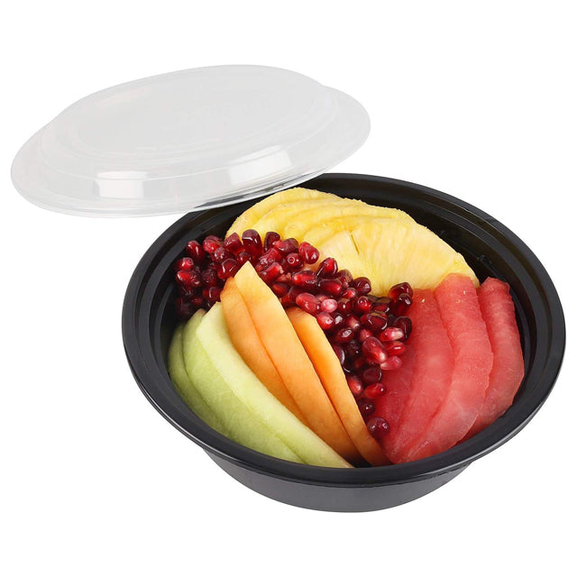 The secure, tight-fitting lids keep food fresh and prevent leaks, making them ideal for take-out, meal prep, catering, and everyday storage. Their sleek black design provides a professional look for restaurants and catering businesses.